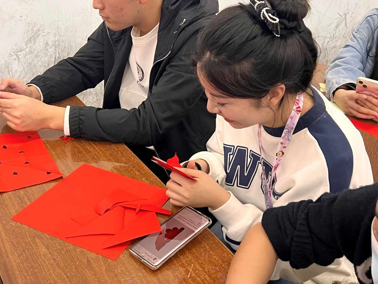活动开始,大家迫不及待地折叠、裁剪技巧,边热烈讨论着剪纸的技巧,智慧在指间流转,剪刀在纸端跳跃,脸上洋溢出欢乐幸福满足的笑声。剪纸,不仅是我国传统文化的象征,也是中华民族的文化瑰宝和人类非物质文化遗产,具有强烈而又鲜活的生命力。它不仅是我们国家特有的一种民间艺术风格,风格奇特,而且同时也是一项手脑并用的实践活动。