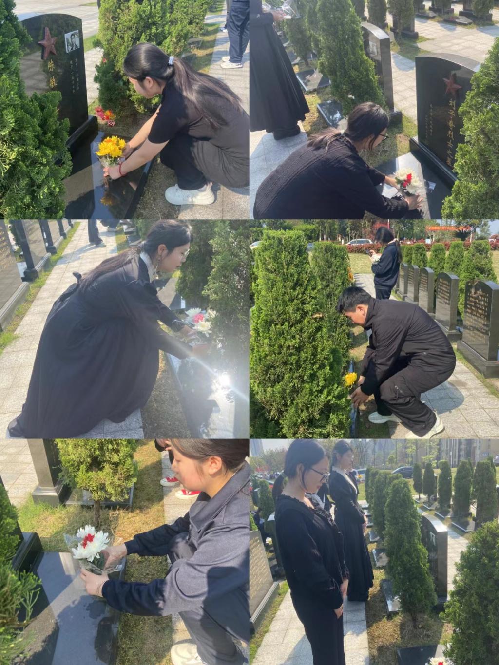32名志愿者们身着黑色衣服早早出发。上午9时许,到达革命陵园,每一名志愿者都被这里庄严肃静的氛围所感染,心怀敬畏之情。革命陵园内,苍松翠柏环绕,烈士墓碑肃然矗立。在工作人员的带领下,志愿者们带着菊花来到了烈士墓区,看着一个个陌生的名字,聆听者他们的故事,感受着他们火热的爱国之心。紧接着,志愿者们整齐列队,向烈士墓碑敬献鲜花,并肃立默哀,表达了对烈士的崇高敬意和深切缅怀之情。最后,志愿者们在园区内进行参观,进一步触摸历史,感受精神,懂得了铭记历史、缅怀先烈、珍爱和平的重要性与时代意义。