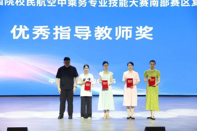 我校参赛团队在苏雅靓、何蕾两位指导老师带领下,以稳定发挥与默契协作突破重围 —— 选手们在各环节中展现出标准化操作水准与临场应变能力,尤其在团体赛 “客舱灭火应急处置” 中,以全流程零失误的表现斩获团体一等奖(总分第一),彰显了 “安全规范 + 服务创新” 的综合实力。赛事闭幕式上,我校选手吴筱悠还登台演奏古筝《我的祖国》为本次大赛画上了圆满的句号。