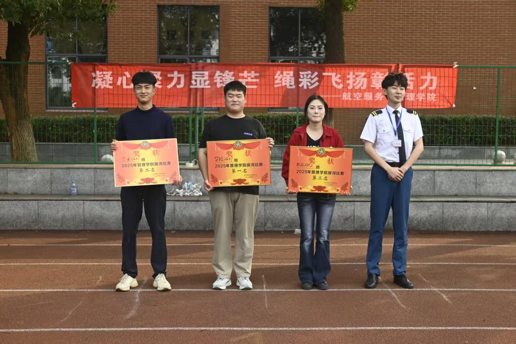赛前,各参赛队伍早早抵达,有序候场。队员们相互击掌鼓劲,认真热身,欢声笑语中斗志昂扬;通过抽签确定出场顺序后,现场弥漫着紧张而热烈的氛围。随着裁判一声哨响,比赛正式拉开帷幕!赛场上的队员们迅速就位,双手紧握长绳,身体后倾,重心下沉,目光坚定。“一二!一二!”整齐有力的号子声响彻操场,每一声呐喊都凝聚着团队的向心力。绳中央的决胜标记在双方间来回拉锯。队员们咬紧牙关,任凭汗水浸透衣衫,依然坚守阵地,用顽强的毅力诠释着“坚持到底”的体育精神。本次比赛采用淘汰赛制,多轮角逐中,既有势均力敌的持久战,也有速战速决的精彩瞬间“决赛阶段,最终安检2401班、空乘2401班、机运2502班脱颖而出分获冠军、亚军、季军。现场掌声与欢呼声不断,共同见证了这份拼搏而来的荣光。