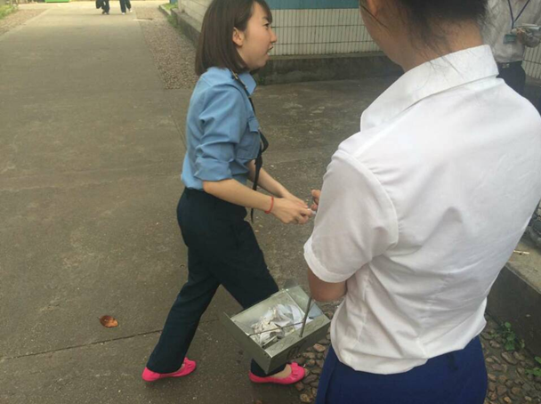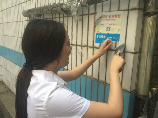 大家每人手中都带有小工具:铲子、扫帚和清洁球。17名同学分成了两组,一组同学负责清除公寓楼下的小广告,一组同学负责清除教学楼区域的小广告。大家清楚任务后马上开始活动。