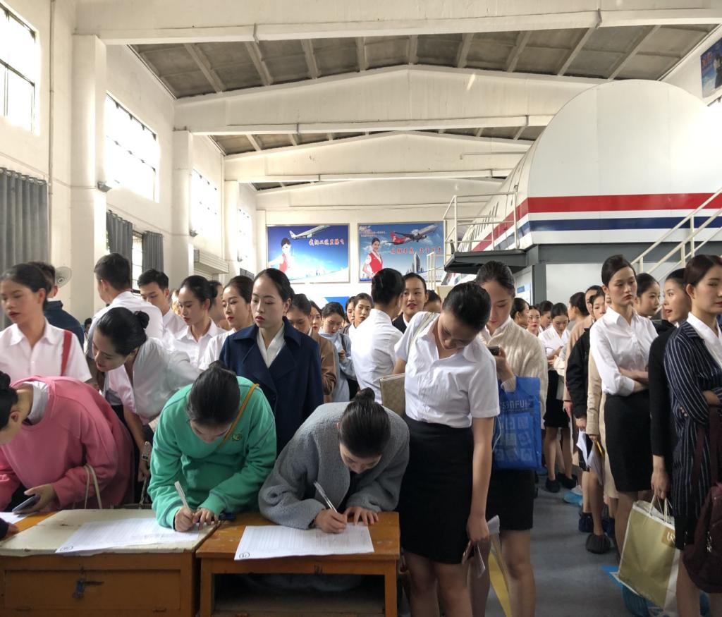 早上七时,应聘者就在候场室外排成了一条长龙,尽管面试人数众多,但面试现场仍然保持尽然有序,在相关学校人员和工作人员的引导下陆续进入面试环节。整个招聘现场分为候场报名、身高测量、初试、复试、笔试五个环节。上午九时,招聘会正式拉开帷幕,应聘人员在我校航空专业师生的引导下有序进入面试现场。应聘者首先要进入候场厅,递交报名材料并签到,随后通过身高、体重、色盲等检测,通过报名材料验证的人分组进行初试,十人一组,共计101组。经过层层选拔,最终有五十余人通过复试,而复试则面临着综合能力面试,对应聘者各方面能力都存在着考验。傍晚九时,招聘工作画上了圆满句号,应聘者将等待用人单位的面试结果及后续安排。