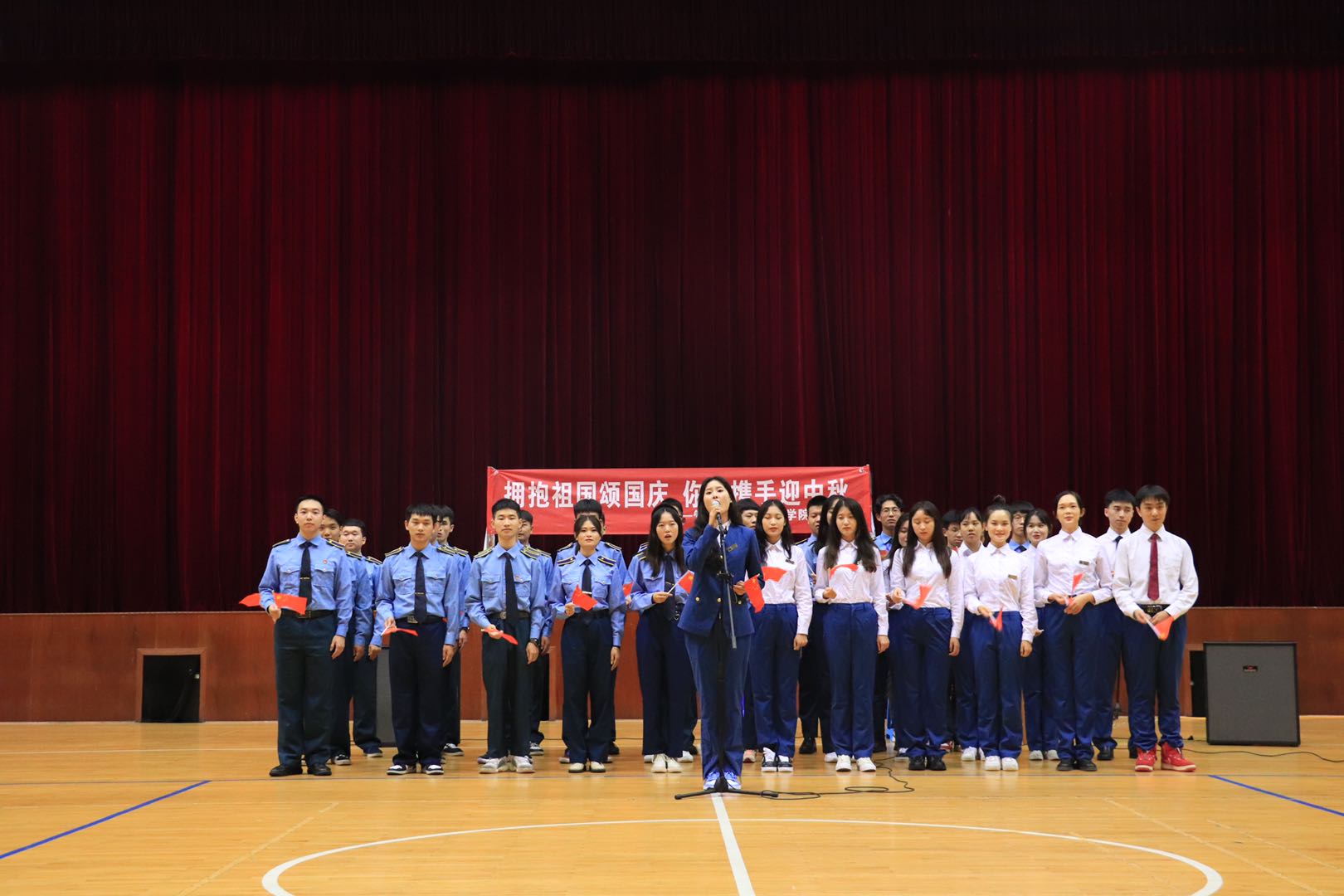 “拥抱祖国颂国庆,你我携手迎中秋”文艺汇演持续近一个半小时,最后在嘹亮动听,旋律激昂的《我和我的祖国》中落下帷幕。汇演不仅给大家带了一场高尚的心灵享受,更是精神的盛宴,为祖国71华诞献上了一份特殊的礼物。此次迎国庆党日活动,增强了学生党员的责任感、光荣感和党员意识,激发了同学们的学习和爱国热情,使大家深深体会到伟大祖国的辉煌成就和作为一名炎黄子孙的光荣自豪感。祝伟大祖国在中国共产党的光辉照耀下富强、民主、文明、和谐。