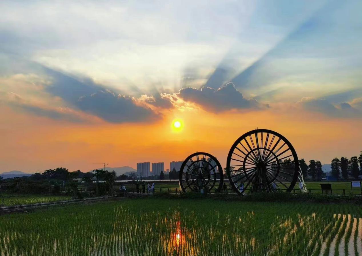 傍晚时分,晚霞映染,瞬间拉近了稻田与天空的距离。远处,云朵从橘色的霞光里浮现,只有这些稻子才配得上这样的色彩,风吹过田野,用手一摸,满手都是金色。一首首行走的生命,有如一句句无声坠落的诗句,在田野里吟咏。沿着游览栈道行走,就像在稻浪里游弋;登上栈道瞭望台远眺,唯美的田园风景令人心旷神怡。“好久没来乡村走走了,没想到变化那么大,风景越来越美了。”不由得将这幅美卷收入囊中。便有了《霞光下的稻田》
