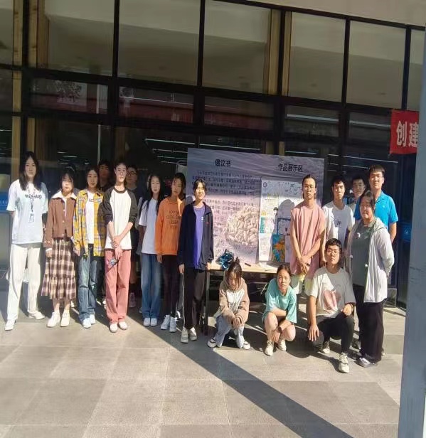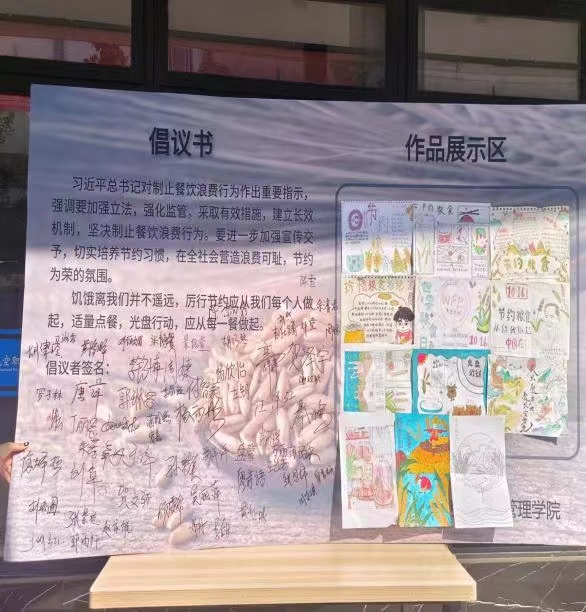 该活动分为线上打卡与线下倡议结合形式开展。线上,同学们在微信群进行一周光盘打卡行动,每日进行专人统计评选。线下,组织人员在二食堂前坪放置“珍惜粮食”倡议展板,号召同学在倡议书上进行签名并承诺,同时收集各班提交的节约粮食主题予以展示。