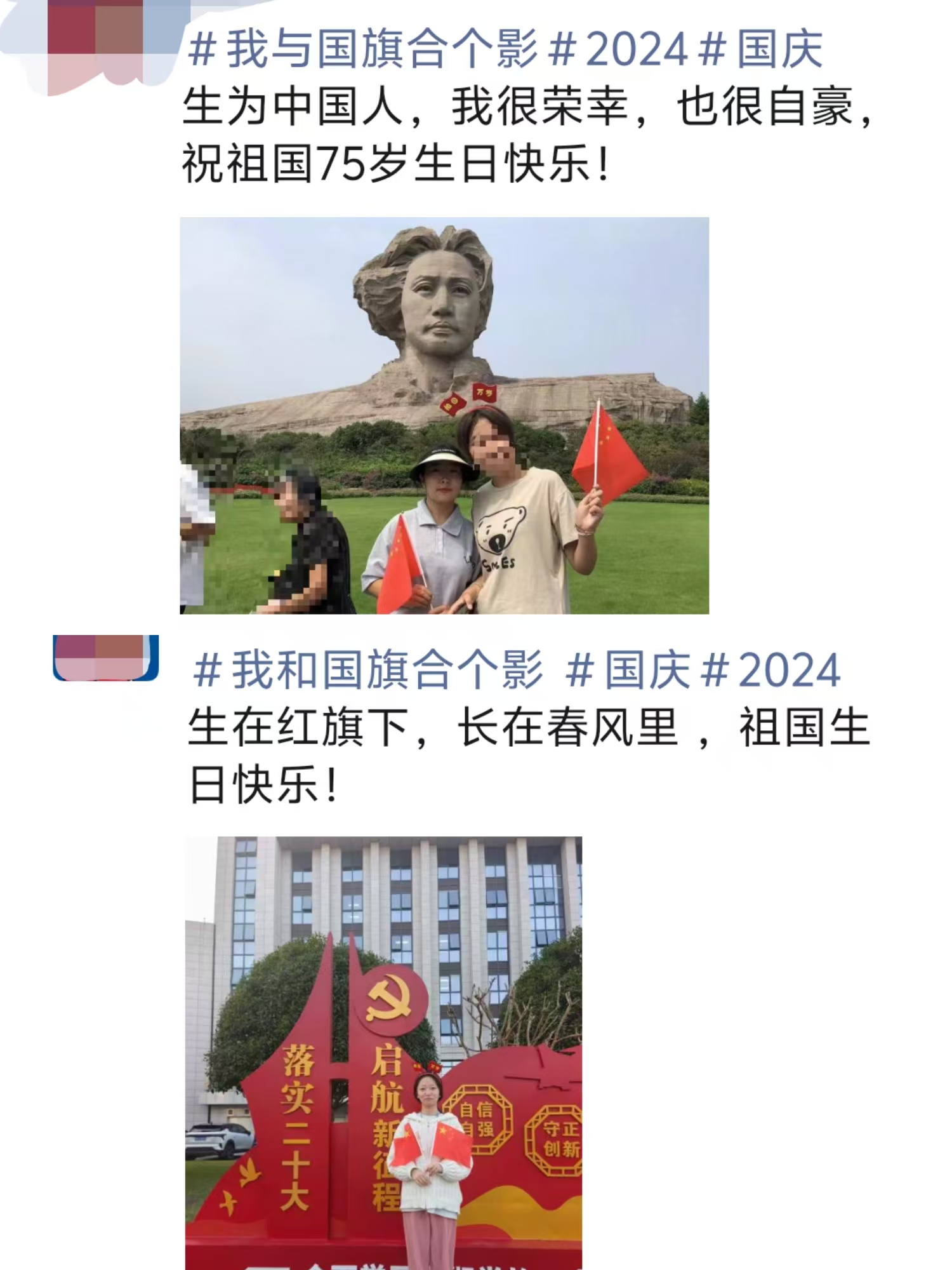 此次活动以创意大合影的方式开展,同学们在国庆假期出游期间与国旗同框合影,用这种方式表达对祖国的热爱和祝福。有的人手举国旗,姿势庄重,彰显出对祖国的敬意,有的人热情洋溢,姿势活泼,展现出对祖国的热爱,每一张照片都充满了对祖国的深情厚谊。与创意大合影同步进行的还有线上互动晒一晒的环节,同学们将与国旗的合影上传到各种社交媒体平台,让更多的人感受到了他们对祖国的热爱。这些照片在朋友圈、微博、抖音、小红书等平台上引起了热烈的反响,成为了国庆期间的一道亮丽风景线。国旗是国家的象征和标志,国庆是国家的重要节日,两者结合起来,同学们在这个特殊的时刻与国旗合影,能够更深刻地感受到对祖国的热爱和自豪之情,内心的爱国情怀会被进一步激发。
