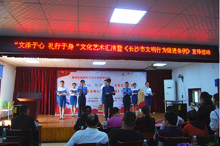 5月10日下午,由雨花区跳马镇政府与beats365官网联合主办的“文泽于心礼行于身”文化艺术汇演暨《长沙市文明行为促进条例》宣传活动在新田村村委会礼堂举行。礼仪操,诗歌朗诵《商鞅》、《盛世中国》,歌曲《父亲写的散文诗》、《赞赞新时代》等精彩节目轮番上演,中间还穿插了《长沙市文明行为促进条例》知识问答互动活动。同学们出色的表演受到了观众的热烈欢迎,活动现场掌声不断。新田村陈大爷笑言,现在农村生活条件好了,吃穿不愁,希望以后这样寓教于乐的文化活动还能多办几次,让村民的闲暇生活也能充实起来。