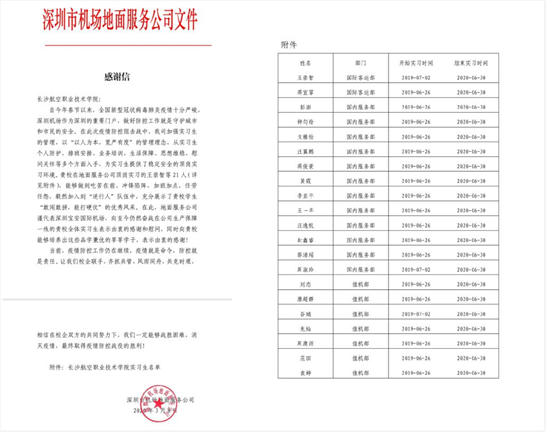 自今年春节以来,全国新型冠状病毒肺炎疫情十分严峻,深圳机场作为深圳的重要门户,做好防控工作就是守护城市和市民的安全。在此次疫情防控阻击战中,我院在地面服务公司顶岗实习的王崇智等21名学生能够做到吃苦在前,冲锋陷阵,加班加点,任劳任怨,毅然加入到“逆行人”队伍中,充分展示了我院学生“敢闯敢拼,能打硬仗”的优秀风采。深圳市机场地面服务公司发来的感谢信,对我院21名正在该公司顶岗实习同学的突出表现给予了高度评价,同时对我院良好的育人成效表示由衷地感谢和认可。