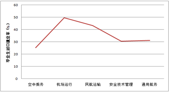 毕业生对口就业率。空中乘务、机场运行、民航运输、民航安全技术管理、通用航务毕业生对口就业率分别为25.38%、49.50%、43.18%、30.48%、31.33%。